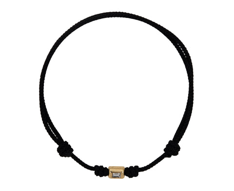 This Luis Morais bracelet is perfect for everyday. The 14K yellow gold charm is set with a white diamond baguette and knotted at the center of a black nylon cord. Adjust the bracelet to fit with the double-knot strands and add it to a stacking collection of your favorites.