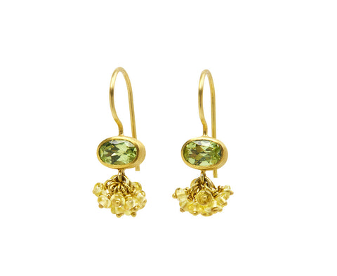 Sunny and sweet, these Mallary Marks earrings possess an exceptional versatility. Faceted yellow chrysoberyl are set in 22K yellow gold bezels and connect to 18K yellow gold ear wires. A dense cluster of tiny yellow sapphire beads create a small tassel which anchors the collection and add a pop of dimension.