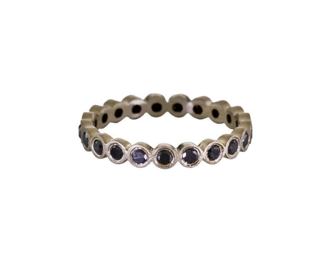 Timeless elegance with a modern twist, this black diamond eternity band is a perfect option for the woman with a confident edge. The brilliant cut black diamonds shimmer from their 18K white gold bezels and connect to create a continuous band. Worn alone, stacked with others or paired with a Mandrel Studio diamond solitaire, it has a stunning, earthy sophistication.