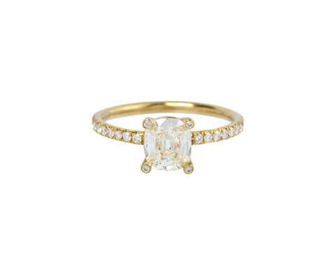 With its stunning take on the traditional diamond solitaire, this Mandrel Studio ring exudes a modern, feminine elegance. The cushion cut diamond shimmers with light from within. It is held in place by four diamond set 18K yellow gold prongs and is centered on a polished 18K yellow gold band set with diamond pavé across the top half. This ring would look great stacked with any Mandrel Studio band.