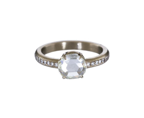 Stunning in its classic simplicity and straightforward elegance, this Mandrel Studio diamond solitaire is certainly 'forever'. The rose cut clear diamond shimmers with light from within. It is centered on an 18K white gold and diamond half round band and fits perfectly next to a Mandrel Studio wedding band.