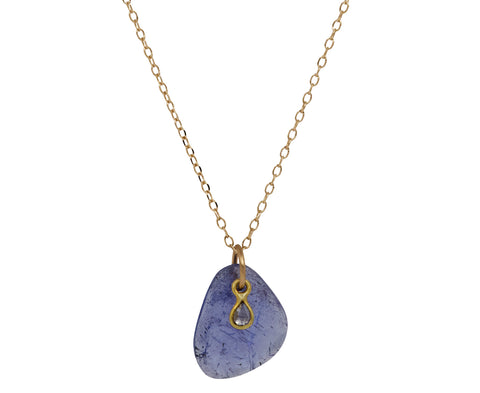 With its quiet sparkle and earthy elegance, this Margaret Solow necklace is a stunning, modern alternative to the traditional colored stone and diamond pendant. A purple tanzanite hangs as the backdrop for a smaller diamond framed by a thin band of 18K yellow gold and both hang from the center of a 14K yellow gold chain. Alone or layered with your other favorites, this necklace can be easily worn from carpool to cocktails.