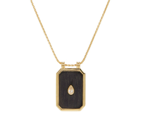 With its combination of stark wood , bright gold and subtle sparkle, this Marie Lichtenberg necklace looks perfect whether worn alone or with your other favorites. The rectangular ebony pendant is set in an 18K yellow gold bezel and has a shimmering, teardrop shaped diamond at its center. It hangs from the 18K yellow gold chain.