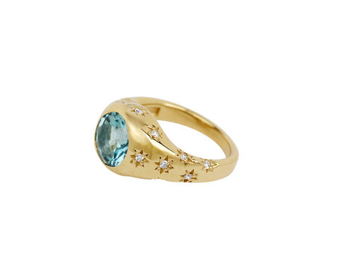 With its cool toned color and modern design, this Marlo Laz ring is a statement-making take on the everyday cocktail ring. The round, pale blue aquamarine is set in a 14K yellow gold bezel at the center of the tapered 14K yellow gold band. Star set shimmering diamonds accent the top of the ring and create a perfect pop of sparkle.