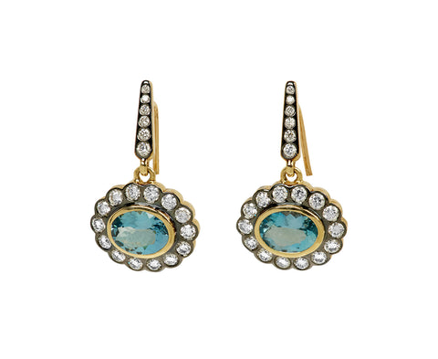 Perfectly balancing vintage-inspired design with a modern vibe, these Marlo Laz earrings are a stunning take on the traditional colored stone drop. The oval aquamarine are set east-west in a 14K yellow gold bezel and surrounded by round, white diamonds. They hang from diamond set 14K yellow gold ear wires. The gold where each diamond has been set has been blackened, creating the perfect amount of contrast.