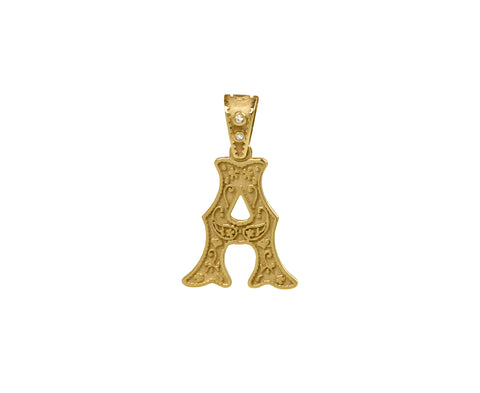 Represent yourself or a loved one with this understated, bohemian Marlo Laz pendant. The flat 14K yellow gold 'A' is covered in paisley and floral motifs and hangs from the tapered 14K yellow gold and diamond bale. Wear it alone or with your other favorites from one of Marlo Laz's chains.