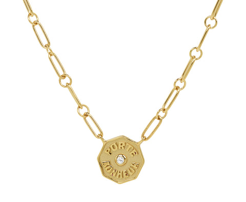 Sweet in scale and sentiment, this Marlo Laz necklace can be worn alone or layered with your other favorites. The petite 14K yellow gold pendant is written with the words 'porte bonheur', or, lucky charm, which surround the center bezel set white diamond. It is set at the center of the 14K yellow gold mixed link chain.