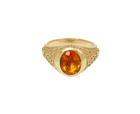 With its vibrant color and bohemian design, this Marlo Laz ring has an understated sophistication. The 14K yellow gold signet style ring face surrounds the bright orange oval citrine. Engraved around the exterior are flowers and paisley, adding the perfect amount of dimension.
