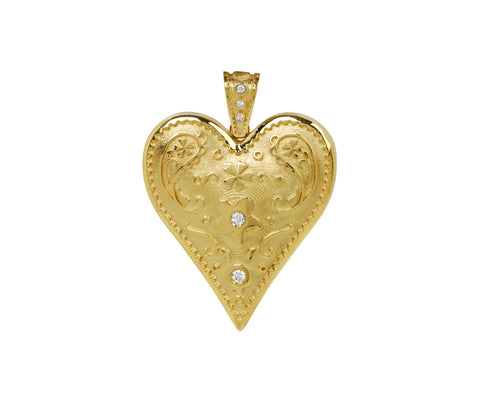 With its three dimensional design and sweet symbolism, this Marlo Laz pendant has an understated elegance. The 14K yellow gold heart has been carved with flowers and paisley and accented by round, white diamonds. The decoration makes its way on to the back of the heart as well, creating a pendant that works perfectly whether worn alone or clustered with your other favorites.
