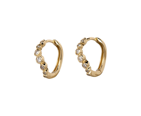 These stunning, graceful Mateo earrings are an eye-catching alternative to the traditional gold and diamond huggie. The 14K yellow gold hoops have a curved surface and are set with tiny, bezel set white diamonds. They connect to 14K yellow gold latch backs.