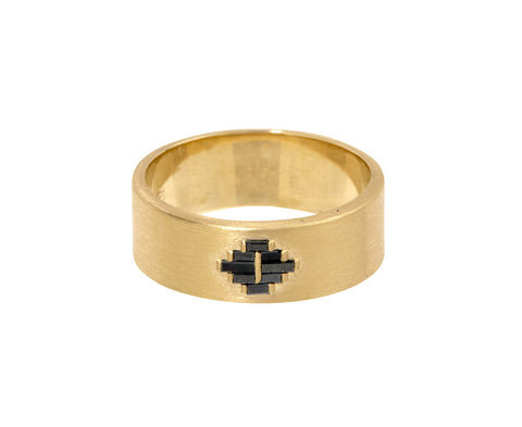 Bold and modern, this Fiat Lux band is an edgy alternative to the traditional wedding band. Set at the center of the wide, matte 14K yellow gold band is their signature arcadia design made out of shimmering black diamonds. This style-defining band would make an excellent choice for someone with a confident sense of style.