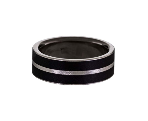 Meticulously hand-wrought and bold in its design, this ring by Pat Flynn has a clean, masculine edge. A stripe of 18K white gold spans the circumference of the blackened iron band to create an eye-catching element of contrast. Modern and interesting, this is a style-defining band he will be proud to wear.