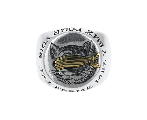 Wear this Digby & Iona signet ring as a playful way to show your artistic side while honoring one of Modern Art's main men, Paul Gauguin. The sterling silver ring has an engraved cat on its front whose eyes are covered in an 18K yellow gold blindfold. Around the ring it reads 'J'ai Ferme Mes Yeux Pour Voir', which translates to 'I shut my eyes in order to see' - a quote form the painter himself.