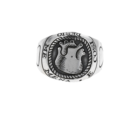 This Digby & Iona ring reads 'E Cosi Desio Me Mena' which translates to 'And So Desire Carries Me Along'. The sterling silver cast ring has a heart on its face and doubles as a wax seal!