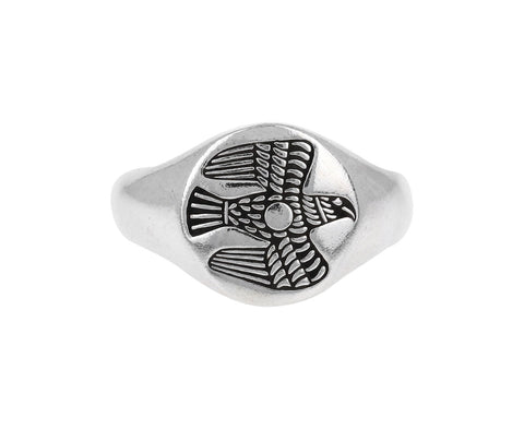 The perfect easy to wear size, this Digby & Iona signet ring is a modern version of the traditional. The sterling silver ring is cast with a horus bird on the front. Simple and straight forward in design with intricate detail this ring is perfect for everyday.