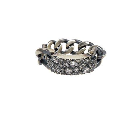 With its fluid design and cool toned sparkle, this hum ring is perfect for the person with an edgy yet effortless sense of style. The lightly oxidized sterling silver chain links surround the slightly curved sterling silver bar which is covered in icy gray diamonds. The softness of the chain allows it to be comfortably slid on and worn.