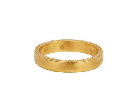 Ultra-classic and timeless, this Single Stone wedding band is ideal for the traditional future groom. The smooth, finely brushed band of 18K yellow gold has meticulous engraving on the top and bottom edges. This is most certainly a ring that will last forever.