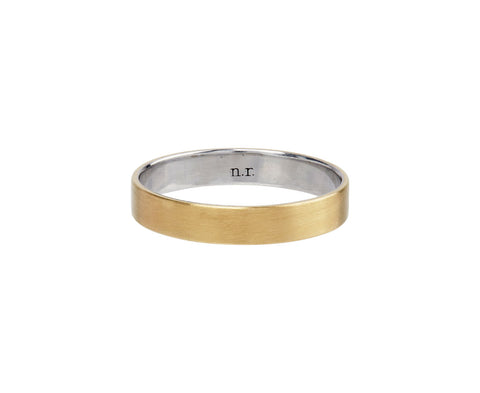 With its regal, classic sophistication and timeless design, this Nikolle Radi ring is a perfect way to symbolize a wedding or commitment. The matte 18K yellow gold band is slightly squared on the outside and lined with platinum along its interior. The perfect understated wedding ring.