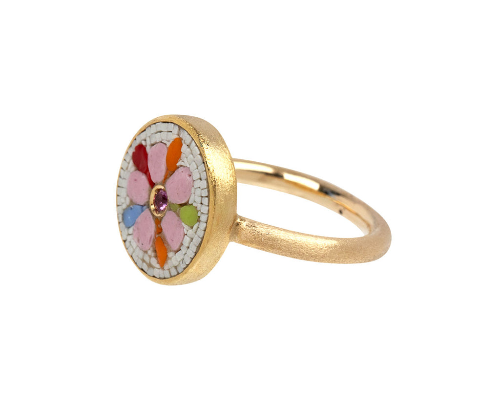 With its sweetly feminine vibe and traditional design, this Le Sibille ring has been painstakingly hand-crafted. The tiny white micromosaic surrounds the pale pink flower which has all been set in the closed back matte 18K yellow gold setting. A round, pink sapphire is bezel set at the center of the flower. The stunning composition is centered on the matte 18K yellow gold band.