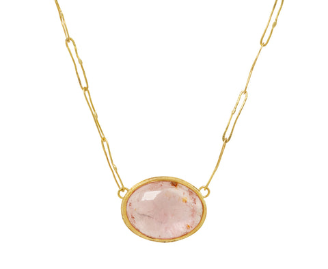 Balancing warm toned color with earthy design, Judy Geib has created a necklace with stunning simplicity. The oval pink tourmaline is polished smooth to reveal its natural tones and inclusions. It is framed in 18K yellow gold and hangs in the center of Judy's 18K yellow gold hand made link chain. Alone or layered with your other favorites, it is a timeless, modern classic.