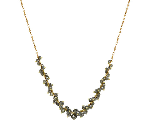 Clustered in the center of this TenThousandThings necklace is a dense spiral of sparkly and reflective salt & pepper diamonds. Each stone is pierced by tiny 18K yellow gold pin which connects it to the 18K yellow gold chain. Alone as a central focus, or layered with your other favorites, it exudes a stunning, modern sophistication.