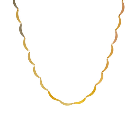 This minimally modern Sia Taylor necklace is the perfect addition to a layered look. The fluid strand is composed of matte, 18K yellow and rose gold and platinum crescents connected by tiny 18K yellow gold rings and closes with an 18K yellow gold spring ring. A stunning way to add a hint of texture to your neck.