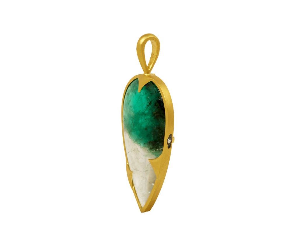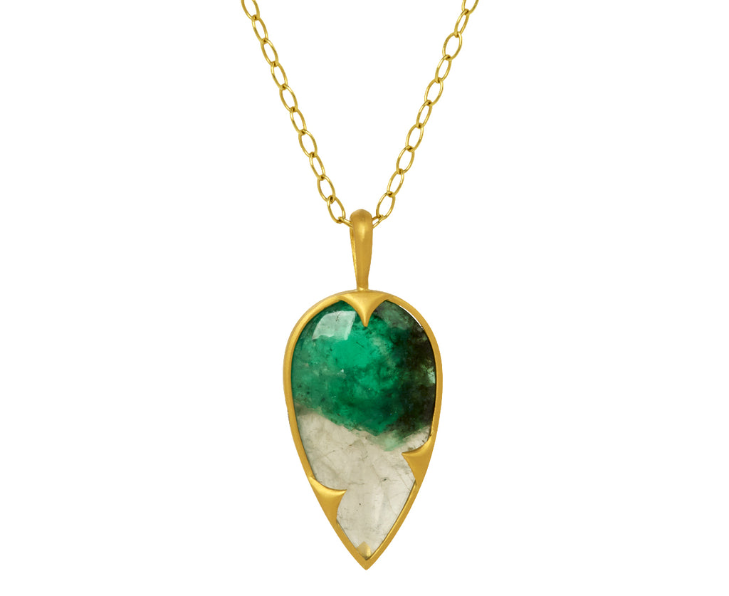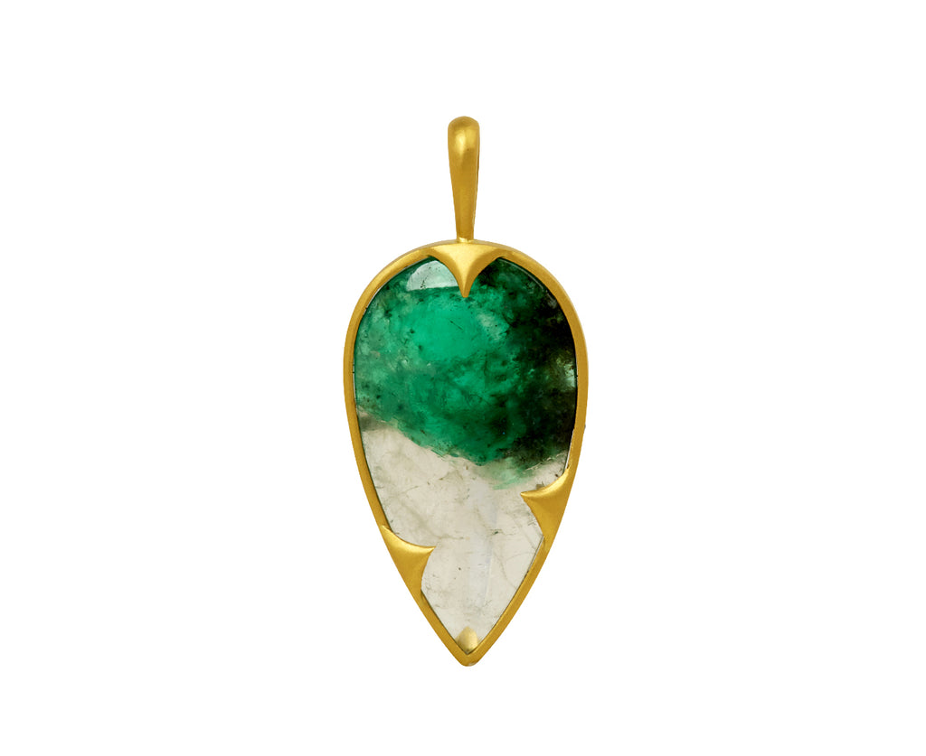 With its stunning, earthy color and natural characteristics, this Cathy Waterman pendant has a one-of-a-kind sophistication. The teardrop shaped sllice of natural Brazilian emerald is framed in a hand-wrought setting of 22K yellow gold. Two round diamonds are set on either side of the bezel for a hint of sparkle. It hangs from the 22K yellow gold bale and begs for a closer look.