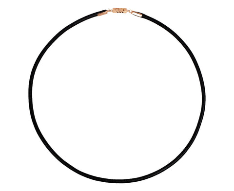 This black leather Deszo necklace is the perfect way to wear her incredible pendants. It is a simple cord with an 18K rose gold clasp with her signature black enamel shark fin design.