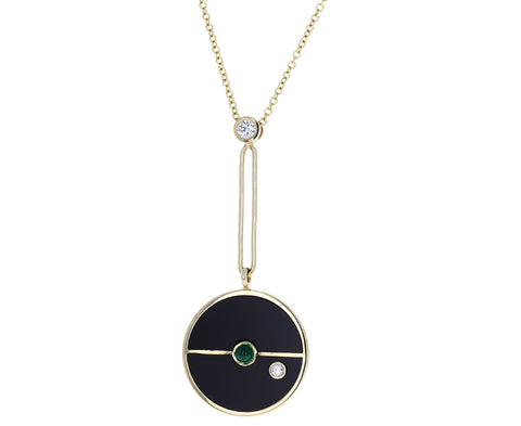 This style-defining Retrouvai necklace balances modern design and dark, neutral tones. The round 14K yellow gold pendant has been set with black onyx which is bisected in half and has a deep green emerald at its center. One shimmering diamond is bezel set at the bottom of the pendant which hangs from the diamond and 14K yellow gold drop at the center of the 14K yellow gold chain.