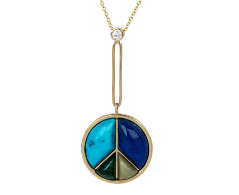 Representing peace, balance and harmony, this Retrouvai necklace will add the perfect pop of colorful symbolism to any look. The 14K yellow gold peace sign pendant has sections of smooth, hand carved turquoise, lapis, malachite and green opal each set around the 14K yellow gold lines. It hangs from her signature 14K yellow gold and diamond loop drop at the center of the 14K yellow gold chain.