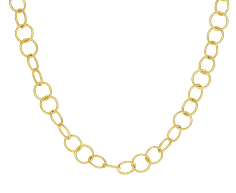 A perfect piece that goes just as well with a cute everyday top as a little black dress, this necklace will quickly become your favorite go-to. Circular links of gold vermeil are connected to form this stand-out necklace. A great length that's easy to wear for most, it adds a pop of style and sophistication to any outfit.