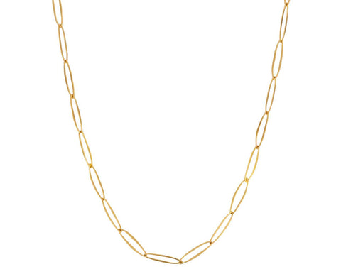 With a stunning fluid presence, this Jane Diaz gold plated chain necklace ups the ante of any casual jewelry collection. The hand-fabricated links connect to one another to create a continuous strand. The resulting look is a perfectly balanced composition of shape and form. The necklace fastens with a gold plated hook and eye clasp closure and can be worn alone or layered with your other everyday favorites.