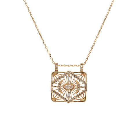 Dramatic and distinctive, this Celine Daoust necklace has a modern, style defining presence. The 14K yellow gold pendant is set with a shimmering diamond eye in the center surrounded by two pave diamond moons and cut outs that add dimension and sparkle. It hangs from the base of the 14K yellow gold chain to create a necklace full of talismanic sparkle.