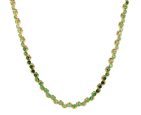 Statement-making with its earthy, moody color, this State Property necklace is unlike anything in your collection. Set along the looping, 18K yellow gold polished gold links are prong set tsavorite garnets varying in tone from pale sage to bright grass green, creating a composition of color and sparkle. Each link connects to create the slinky, continuous chain.