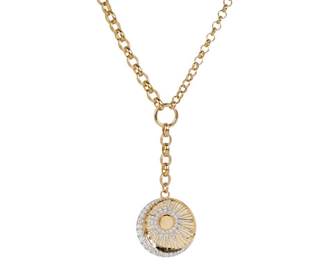 Solid and substantial, this Foundrae necklace will become your everyday talisman. The 18K yellow gold medallion hangs at the base of the heavy belcher extension at the center of the 18K yellow mixed heavy and medium chain. Depicted on the front of the 18K yellow gold is a shimmering diamond moon and sun creating a subtle yin yang, representing individual balance. This necklace is perfect alone or layered with your other favorites.