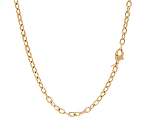 This Renna necklace is a playful update on the traditional gold chain. The slightly oversized matte 18K yellow gold lobster clasp accents the handmade oval 18K yellow gold gold links. With it's cheeky vibe and easy-to-wear style you'll wear this necklace with everything you own.