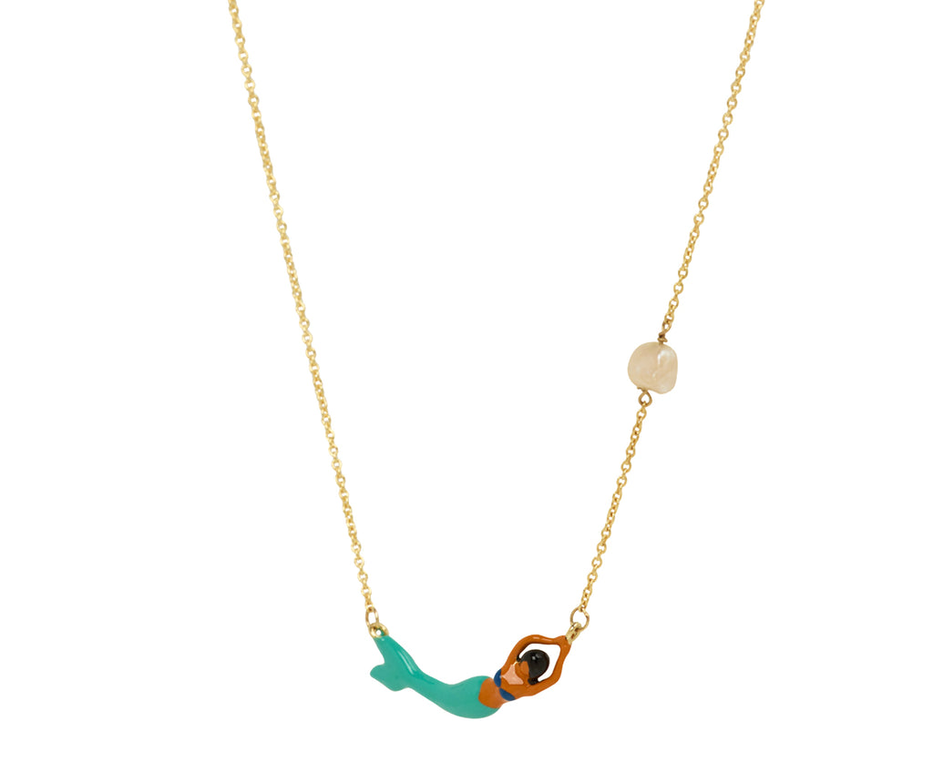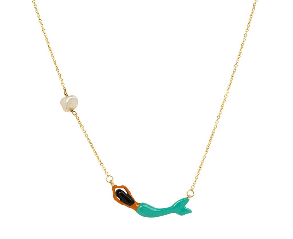 Wear this Aliita necklace when you need a little good luck charm when diving in to a new adventure. The tiny 9K yellow gold mermaid has been hand painted in black, blue and brown enamel. set at the center of the adjustable 9K yellow gold chain right next to the small pearl. It closes with a 9K yellow gold spring ring clasp.