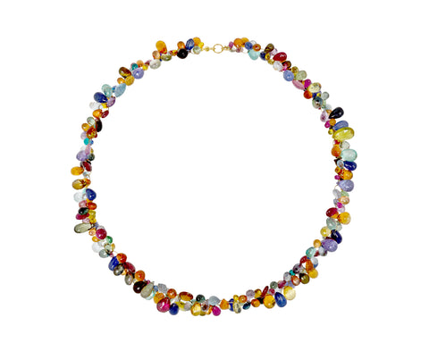 This breathtaking, statement-making Mallary Marks necklace is a stunning combination of rainbow briolettes. The teardrop shaped briolettes - sapphire, zircon, ruby, tanzanite, emerald, spinel, aquamarine, amethyst, citrine, garnet, tourmaline and garnet - are densely set along the thin 18K yellow gold loops which connect to one another to create the collar-length strand. It closes with a handmade 18K yellow gold hook and eye clasp.