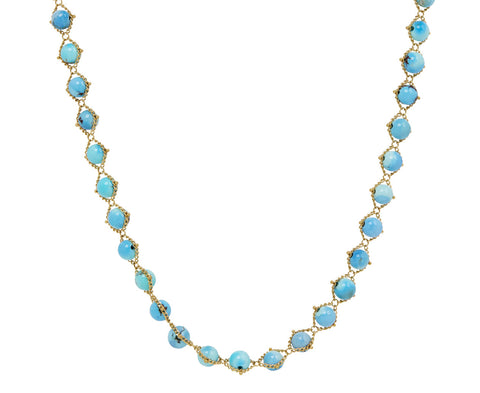 With its intricate, fabric-like fluidity, this stunning Amali necklace was inspired by the rich textures of textiles. Each of the sky blue turquoise beads are meticulously hand woven into 18K yellow gold chain to create the dramatic strand. As striking as it is statement-making, it also offers a subtle texture and bohemian elegance. Alone or layered with your other favorites, its restrained luxe is perfect with everything from casual to formal.