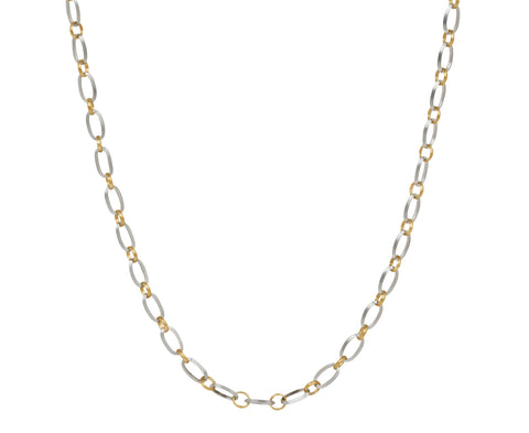 A contemporary and fluid combination of platinum and 18K yellow gold create this Nikolle Radi necklace. The oval, matte platinum links are each connected by small, 18K yellow gold round ones and it closes with the mixed metal hook and eye clasp. It's perfect whether worn alone or layered with your other favorites.
