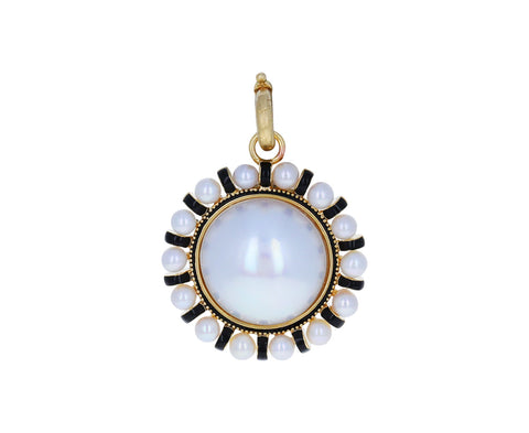 This striking Storrow charm is a jaw dropping example of modern meets vintage design. The large white pearl is set at the center of the black enamel bezel and surrounded by smaller white pearls. Between each white pearl is a black enamel painted strip of 14K yellow gold. It hangs from the 14K yellow gold clasp, positioned to be a versatile addition to any chain bracelet or necklace.