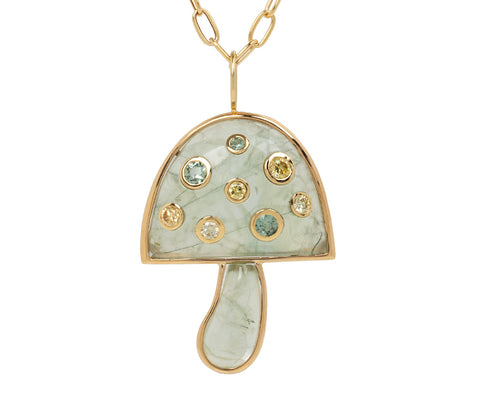 With its playful, nature inspired design and hint of earthy color, this Brent Neale necklace has become one of her signature designs. The pale green prehnite mushroom is set on a frame of 18K yellow gold and set with sparkling white, blue and champagne diamonds. The pendant hangs from the center of the long 18K yellow gold chain which fastens with a lobster closure. Perfect alone, it also adds a cheeky vibe to a layered necklace look.