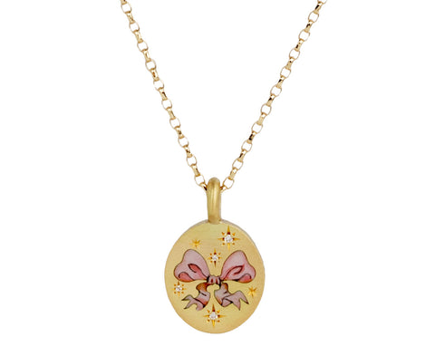 Inspired by the whimsy of Rococo-style paintings, this Cece Jewelry necklace is meant to be worn as a declaration of sweetness and love. The oval, matte 18K yellow gold pendant has a hand-enameled Champlevé enamel pink bow at its center which is surrounded by tiny, star set diamonds. Engraved on the back is a tiny heart pierced by an arrow and surrounded by three additional diamonds. It hangs from the adjustable 18K yellow gold chain and will add a sweet, symbolic vibe to any outfit.