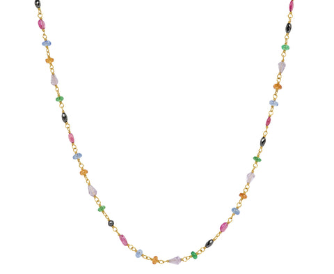 A rainbow of tiny beads make this quietly elegant Mallary Marks necklace a must-have for any serious collector. With a color to match everything, each bead - including black diamonds, amethyst, mandarin garnet, tsavorite garnet, light blue sapphire and pink tourmaline - is wrapped in 22K yellow gold wire to create the continuous strand. Layered with your other favorites or worn alone, it also offers an understated elegance.