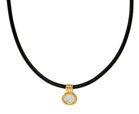 Influenced by the engineering and creativity of Jacques Cousteau, this Beck Jewels necklace perfectly represents luxurious, bohemian design. The 18K yellow gold mini scuba pendant is covered in a surface of sparkling white diamonds and hangs from the wide 18K yellow gold bale. It hangs along the adjustable black leather.