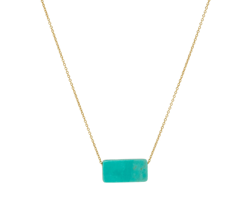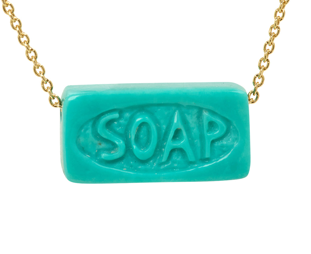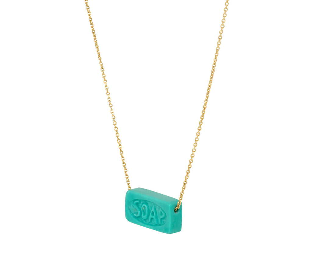 Perfectly combining playful design and a retro inspiration, this Aliita necklace can easily be added to a layered look or worn alone. The 9K yellow gold adjustable chain has a turquoise bar of soap at its center. It closes with a 9K yellow gold spring ring clasp.