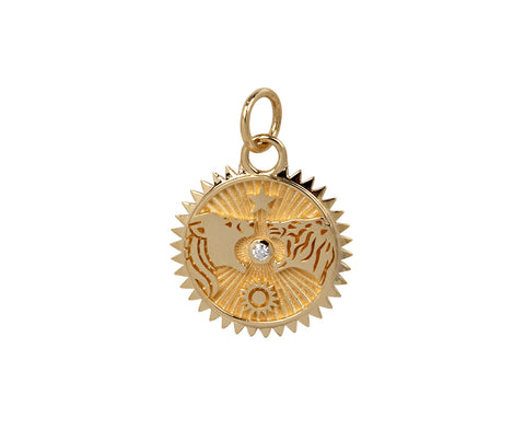 This sparkling Foundrae pendant has a modern, three dimensional design. Depicted on the 18K yellow gold round baby medallion are two carved silhouttes -one of a roaring lion and one of a tiger. They surround the bezel set diamond below three tiny stars. It hangs from the 18K yellow gold bale and can be added to any Foundrae chain.