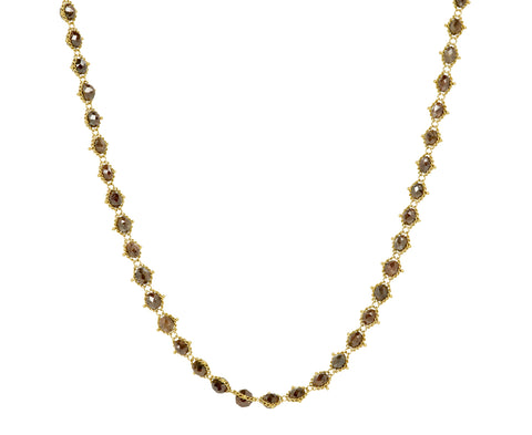 With its fluid form and versatile color story, this Amali necklace can make its way into any look you create. The faceted beads of brown rustic diamonds are woven into the 18K yellow gold chain setting which weave together to create the single strand. Alone or layered with your other favorites, it adds a modern, classic vibe to any collection.