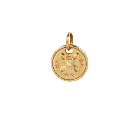 Stunning in its modern, minimal design, this sweetly symbolic Foundrae pendant can be added to any of their handmade chains. The 18K yellow gold mini coin charm has a tiny bowen's knot at its center alongside seven engraved stars. One tiny diamond sits at the center of the charm adding a hint of shimmer. The small medallion hangs from an 18K yellow gold bale.