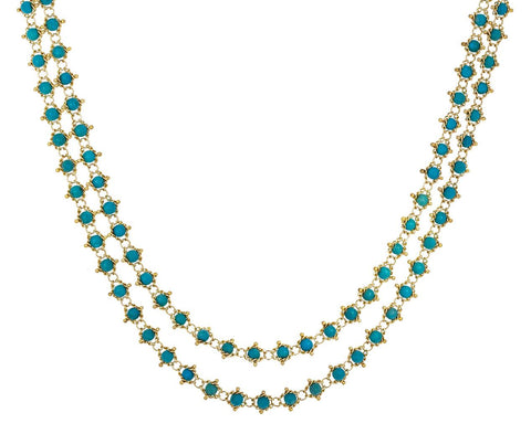 With its intricate, fabric-like fluidity, this stunning Amali necklace was inspired by the rich textures of textiles. Each of the vibrant turquoise beads are meticulously hand woven into 18K yellow gold chain to create the long, dramatic strand. As striking as it is statement-making, it also offers a subtle texture and bohemian elegance. Alone, wrapped around your neck a couple of times, or layered with your other favorites, its restrained luxe is perfect with everything from casual to formal.